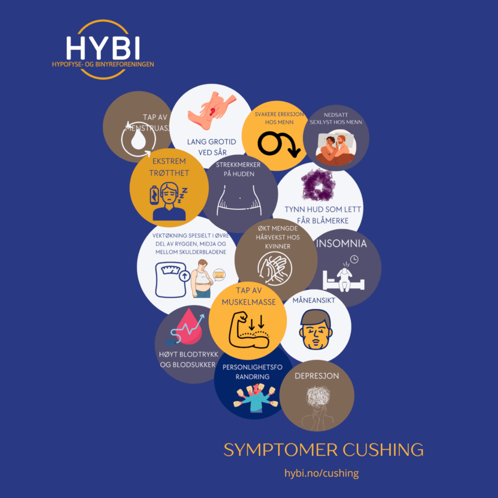 Cushing, også kjent som hyperkortisolisme, er en sjelden lidelse som oppstår når kroppen produserer for mye kortisolhormon. Kortisol er et hormon som naturlig produseres av binyrene og er involvert i regulering av ulike funksjoner i kroppen, inkludert metabolisme, immunsystemrespons og stressrespons. Det finnes to hovedtyper av Cushings syndrom: endogen og eksogen. Endogen Cushings syndrom skyldes overproduksjon av kortisol av kroppen selv, mens eksogen Cushings syndrom skyldes inntak av kortisol som medisin eller steroider. Symptomene på Cushings syndrom kan inkludere vektøkning, spesielt i ansiktet og rundt midjen, høyt blodtrykk, diabetes, tynne hud, blåmerker og muskelsvakhet. Diagnosen stilles vanligvis ved hjelp av blodprøver, urinprøver og bildediagnostikk. Behandlingen av Cushings syndrom avhenger av årsaken til tilstanden. Hvis det skyldes en svulst, kan kirurgi være nødvendig for å fjerne svulsten. Medisiner som senker nivåene av kortisol kan også brukes til å behandle symptomer på Cushings syndrom. Det er viktig å behandle Cushings syndrom for å forhindre komplikasjoner og redusere risikoen for langsiktige helseproblemer. Hvis du har mistanke om at du har Cushings syndrom, bør du oppsøke legen din for å få en evaluering og riktig behandling.